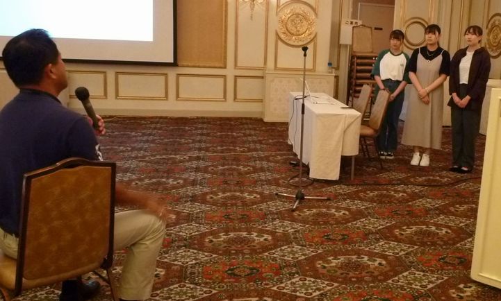 President Kenji Ohyama of the KC of Sendai congratulates the finalist Takamori Junior High School team.